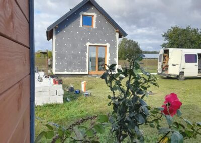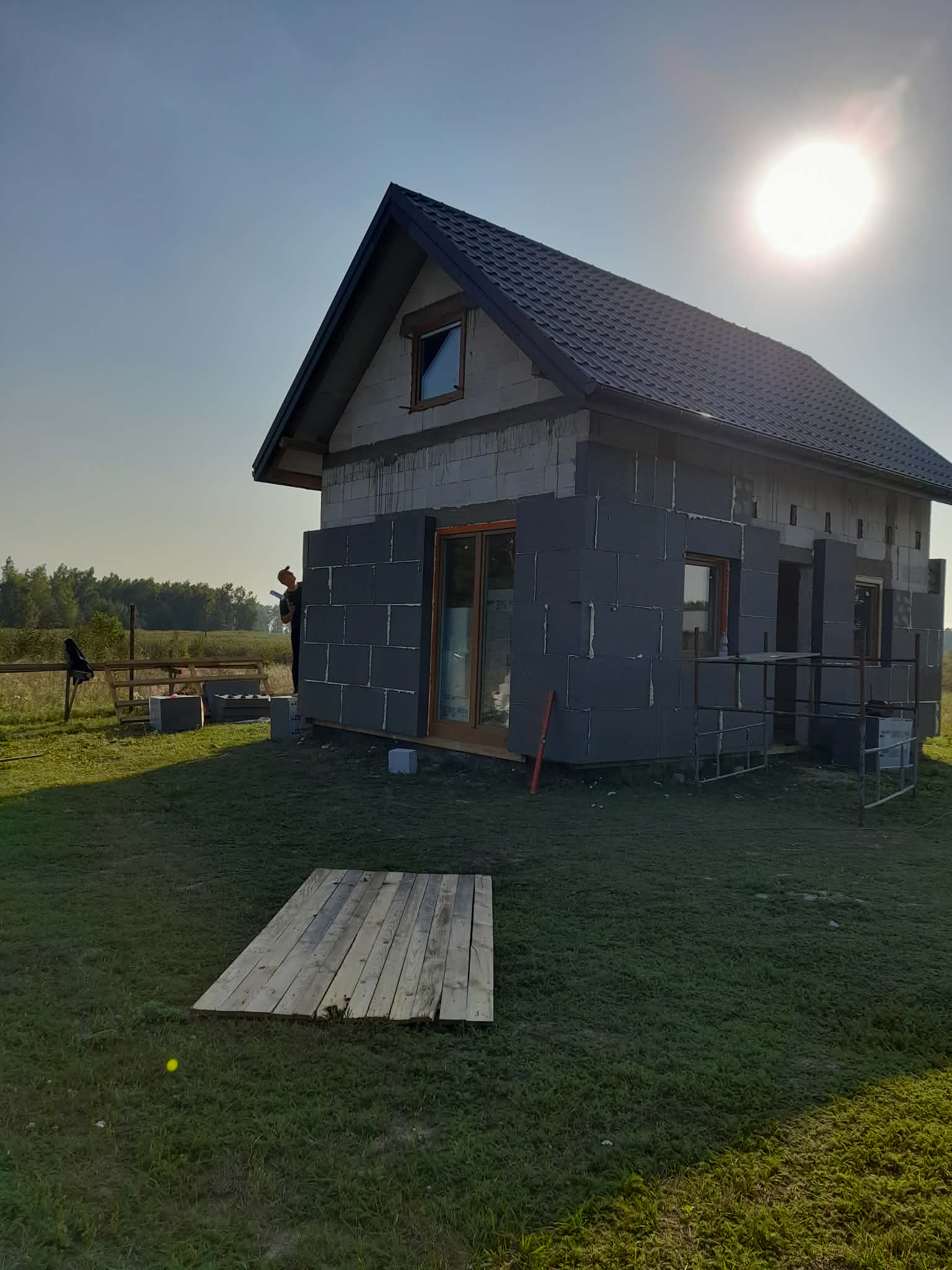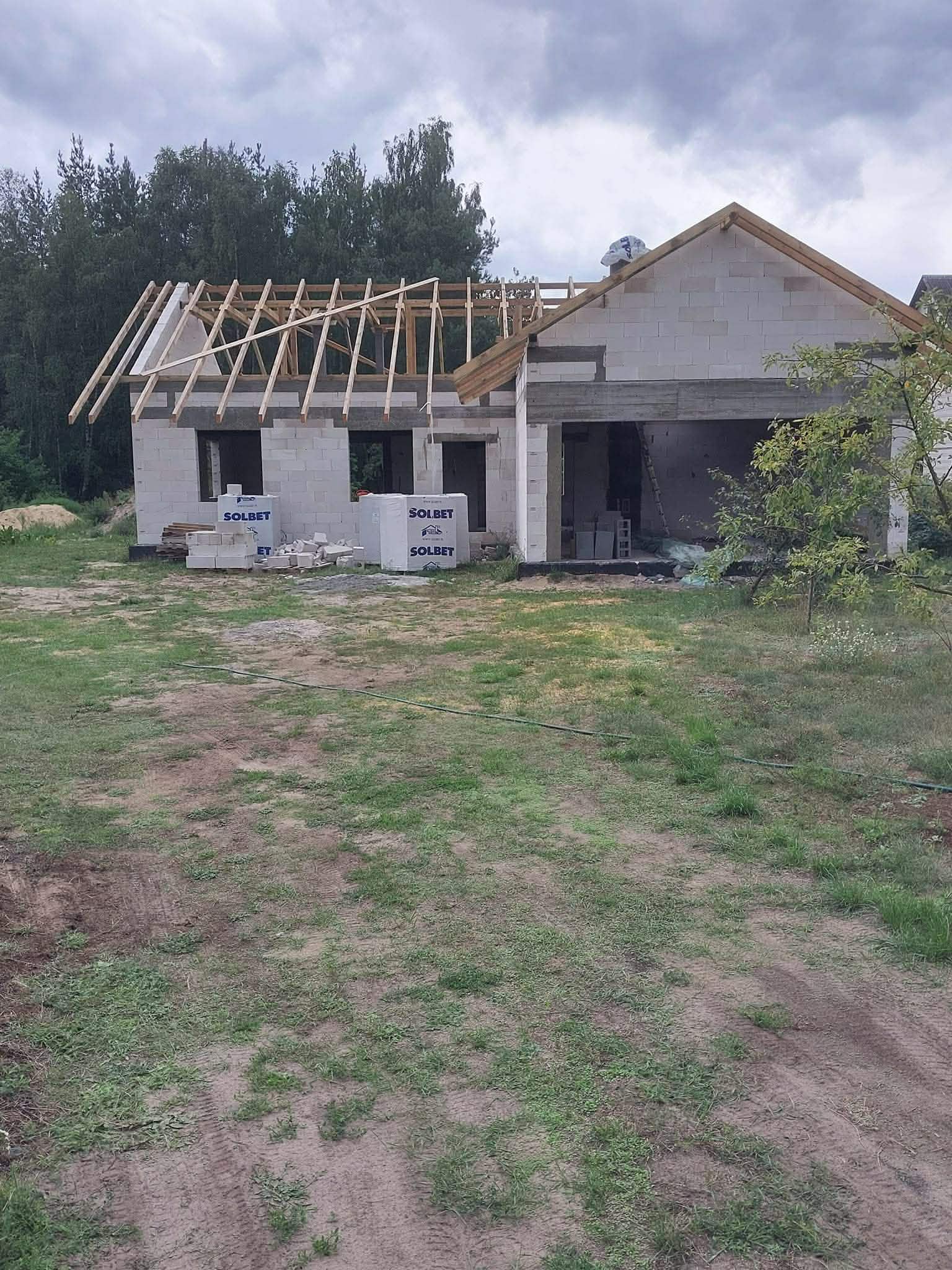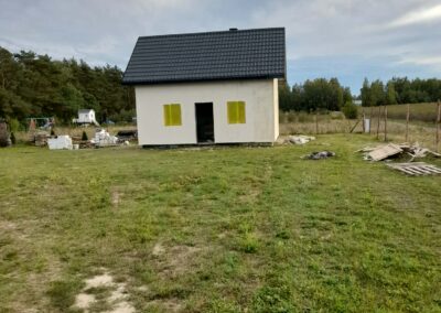 Wykonujemy konstrukcję budynku obejmującą fundamenty, ściany, stropy, schody, kominy oraz konstrukcję i pokrycie dachu. To solidna baza do dalszych prac budowlanych.